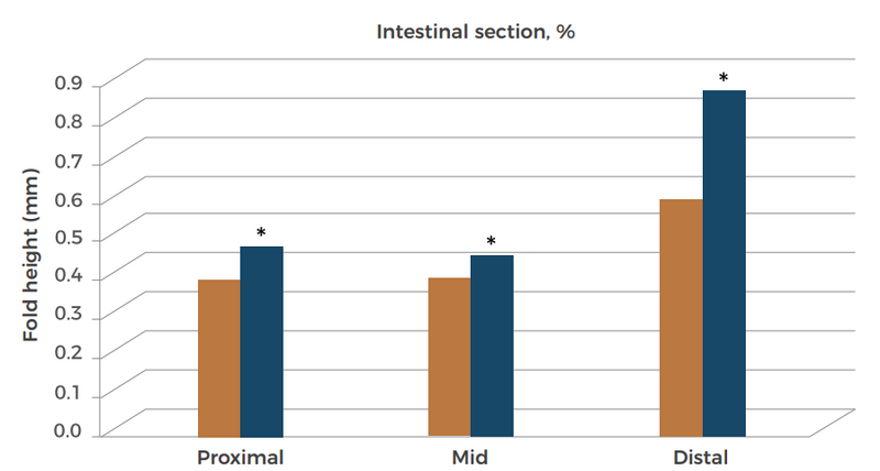 YeaNucleo is a concentrated nucleotide or its precursor product extracted from brewing yeast. It can supplement the deficiency of nucleotide synthesis in animals during stress or rapid growth processes. In addition, it can enhance palatability, improve intestinal health, promote development, immunity, and growth. The experimental results showed that adding 300mg/kg YeaNucleo to the feed significantly increased the height of intestinal folds in salmon (Figure 1), indicating that YeaNucleo has a good effect in promoting the growth and development of the gastrointestinal tract.