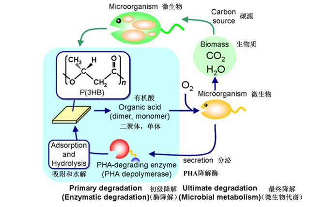 PHA undergoes a two-step degradation process: biodegradation followed by bioassimilation. Initially, microorganisms secrete enzymes that cut PHA’s long molecular chains into smaller fragments, releasing them into the environment to continue the ecological cycle.
