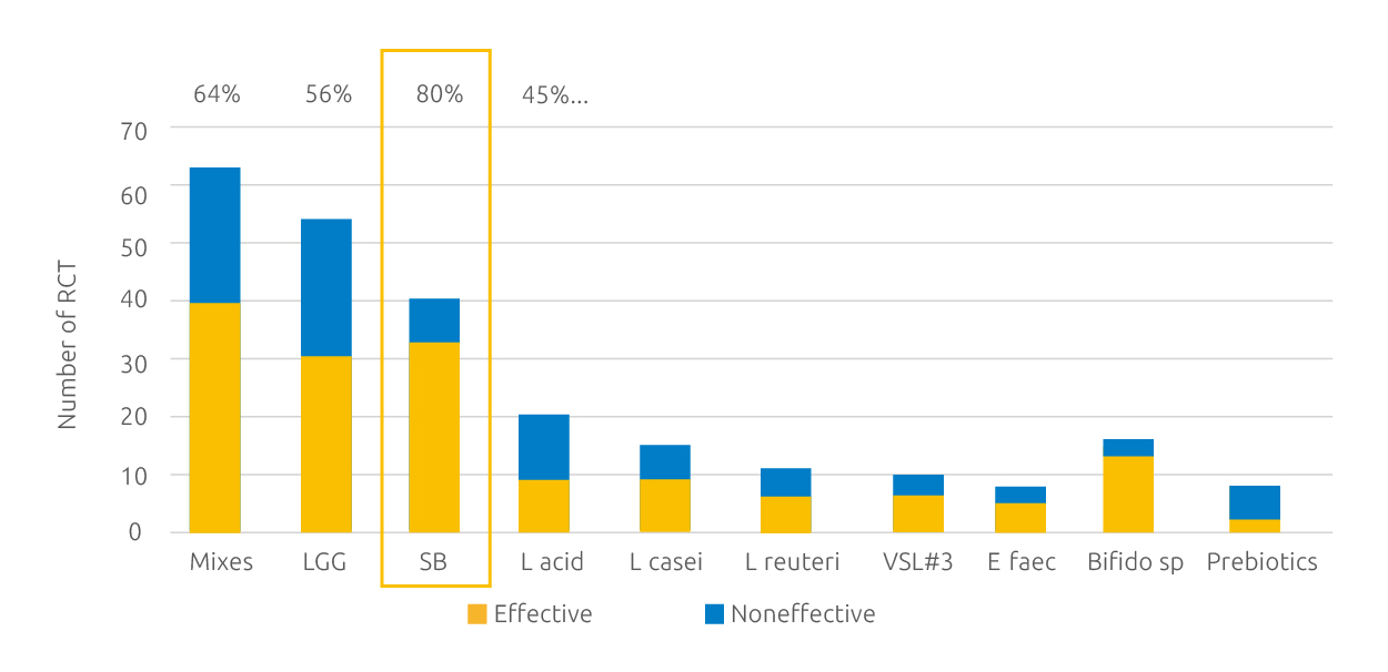 من بين نتائج التحليل التلوي لـ 273 تجربة سريرية لمختلف البروبيوتيك، تأتي S. boulardii ضمن أفضل ثلاثة أنواع من حيث عدد التجارب السريرية، حيث يبلغ معدل نجاح التجارب السريرية للبروبيوتيك الأخرى حوالي 50%، في حين أن S. boulardii تحقق معدل نجاح مرتفع يصل إلى 80%.