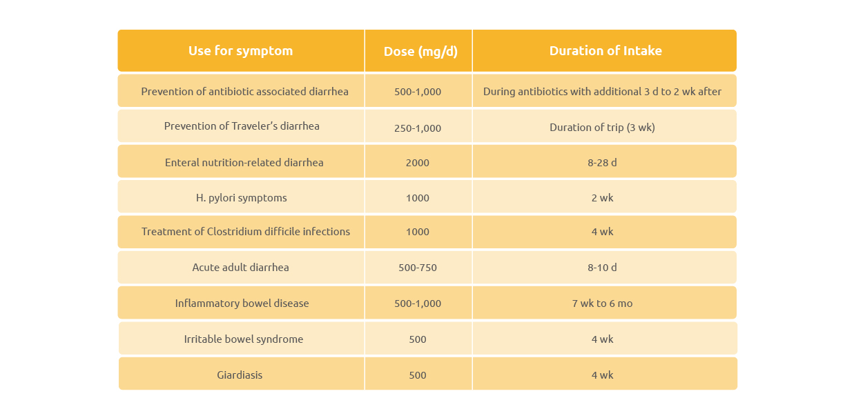 يمكن تطبيق S-boulardii بسهولة في كبسولات أو أعواد أو أكياس. الجرعة اليومية العامة هي 250 ملغ (ما يعادل 5 مليار وحدة مكونة للمستعمرات لكل جرام) تؤخذ أثناء السفر أو عند بدء العلاج بالمضادات الحيوية وتستمر لعدة أيام بعد التوقف عن تناول المضادات الحيوية.