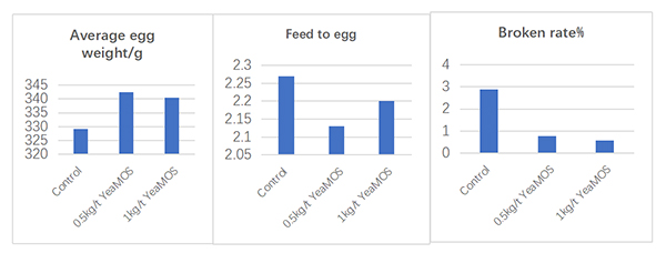 Compared with Control group, the diet supplemented with 0.5 or 1 kg/t yeast cell wall (YeaMOS, provided by Angel Yeast Co. LTD) increased the average egg weight by 4.01% and 3.44%. Meanwhile, the feed to egg ratio in YeaMOS group was decreased by 6.17% and 3.08%. Additionally, the broken rate of egg was reduced by 73.21% and 80.37%, respectively (He Miao et al., 2018).
