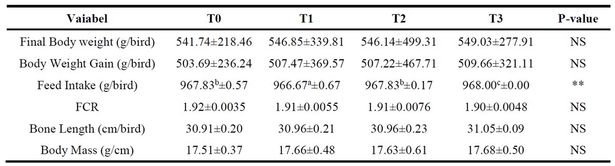 Note: NS: non - significant, **:a-c in the different row showed significantly different (p<0.01) on the treatment.