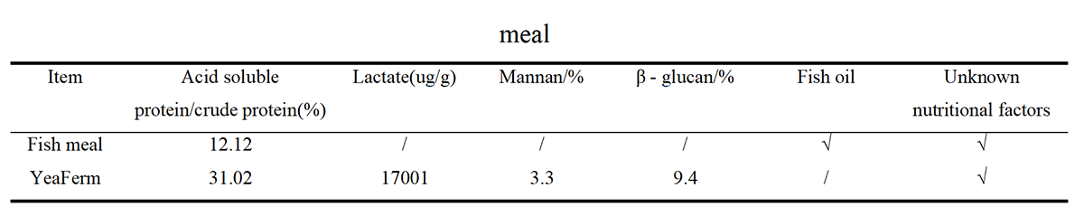 The results showed that the acid soluble protein/crude protein of YeaFerm was 1.56 times higher than that of fish meal, and there were unknown nutritional factors, as well as substances such as lactic acid, oligosaccharides, and β - glucan that fish meal did not have (Table 1).