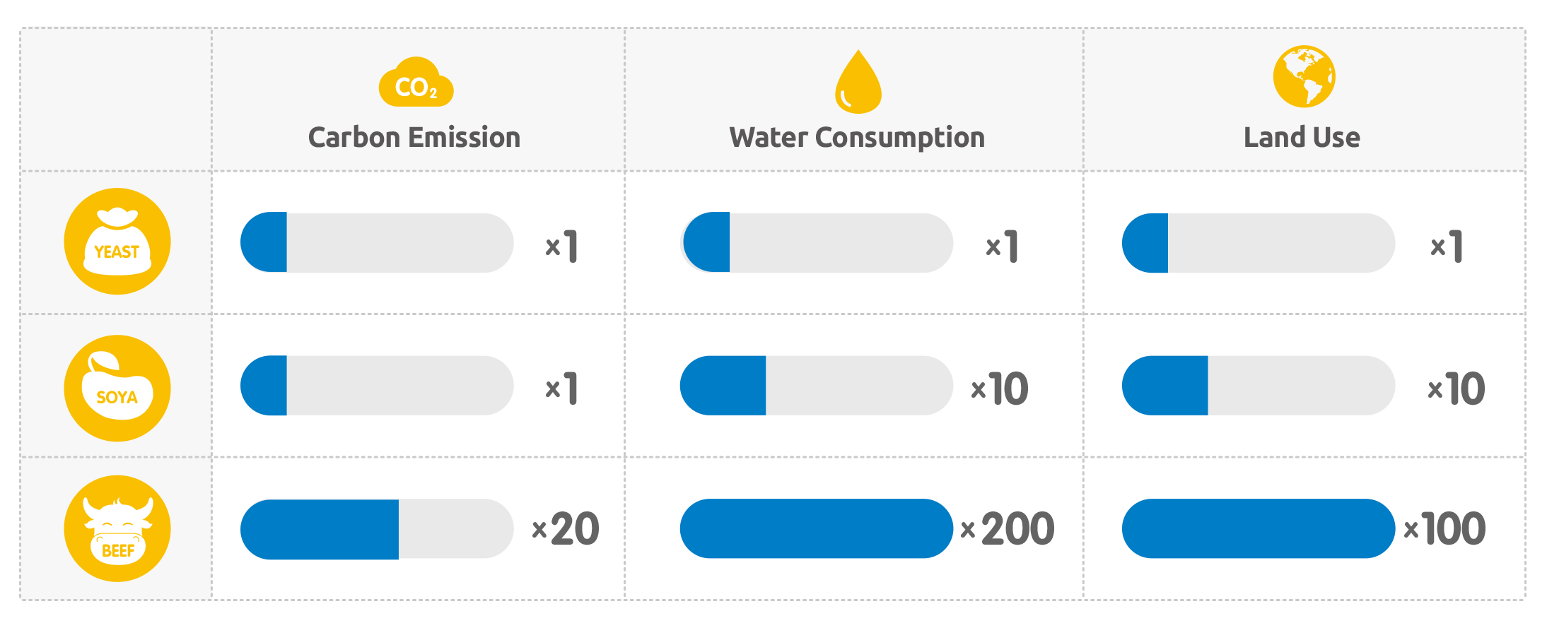 Angel Yeast explored the environmental influence and resource consumption of its Angel Yeast Protein. Compared to both animal and plant protein, yeast protein can significantly reduce water consumption, occupy less cultivated land and generate less carbon footprint.