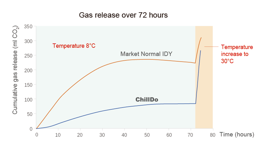 Nachdem der Teig auf eine Temperatur von 30°C zurückgebracht wurde, steigt die Hefeaktivität schnell an, was zu einer schnellen und stabilen Fermentation des Teigs führt.