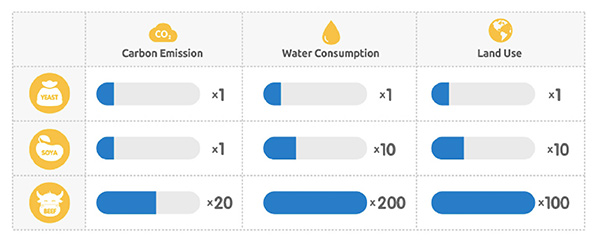 En comparación con las proteínas de origen vegetal y animal, AnPro también puede reducir el consumo de agua y la huella de carbono, requeriendo al mismo tiempo menos tierras de cultivo, todo ello gracias al eficiente proceso de fabricación patentado de Angel. (Figura 9)