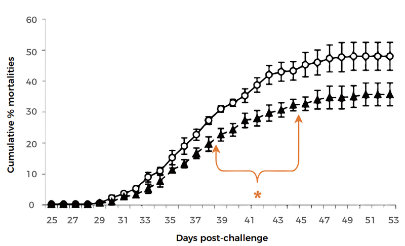 When an animal's body experiences immune stress, the synthesis of endogenous nucleotides in the body cannot meet the requirements of immune cells. By adding nucleotides, fish's resistance to various pathogens, such as bacterial pathogens and viral pathogens, can be enhanced. The experimental results showed that adding 300mg/kg YeaNucleo to the feed can significantly reduce the cumulative mortality rate of salmon after poisoning (Figure 2), indicating that YeaNucleo has a good effect in enhancing the immunity of salmon.