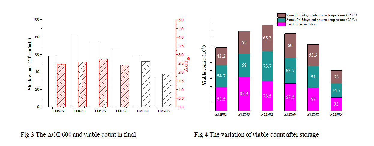 Fig 1and Fig 2 shows the optical density and pH variation of different Yeast Extract for Lactobacillus acidophilus in detail, Fig 3 and Fig 4 show the final viable count and the variation of viable count after storage for 3d or 7d. The results present optical density ranges from 2. 4 to 2. 8 at the end of the fermentation of Lactobacillus acidophilus and make a difference in viable count. While using FM803 as nitrogen source, the highest viable count was observed, but it decreased more than 30% after 7d’s storage. When using the yeast extract that is rich in nucleotides (FM502), the highest optical density was observed, though the viable count was 10% less than FM803 at the end of the fermentation, it showed good stability during storage. Though FM905 has no advantage in gaining biomass, it barely showed decrease in biomass during the storage.
