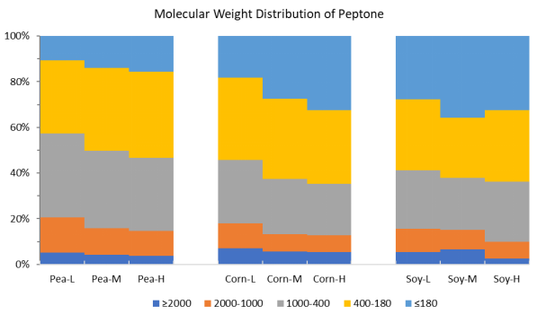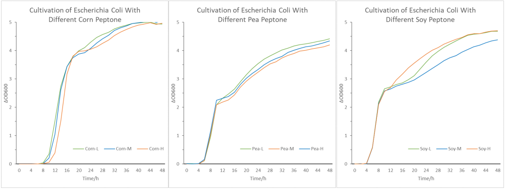 As shown in the figure above, pea, corn and soybean peptone with different degrees of hydrolysis (L, M and H represent low, medium and high degrees of hydrolysis respectively) are obtained through the control of enzymatic hydrolysis. The peptone with its molecular weight distribution showing high hydrolysis degree is more abundant in the small molecular weight peptide fragment. With the use of the above peptone products to culture E. coli, the test results are shown in the following figure: