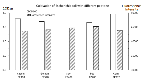 From the results of the above figure, it can be found that the expression levels of OD600 and green fluorescent protein are different when E. coli is cultured with different peptone. Among them, the biomass and expression level of E. coli with soybean peptone FP408 as the nitrogen source both exceed that of animal peptone (casein peptone FP318 and gel peptone FP328). Although pea peptone has a slightly lower biomass than that of other peptone, it achieves the highest expression level, with per unit bacteria reaching 13577, which is 11.7 percent higher than that of casein peptone. At the same time, although the expression level of corn peptone was relatively low, its biomass was higher than that of other peptone.