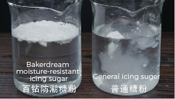 In this picture, the moisture-resistant icing sugar is basically insoluble in water because of the coating technology used. As a surface decoration, it can keep bakery and pastry products white and dry for a long time.