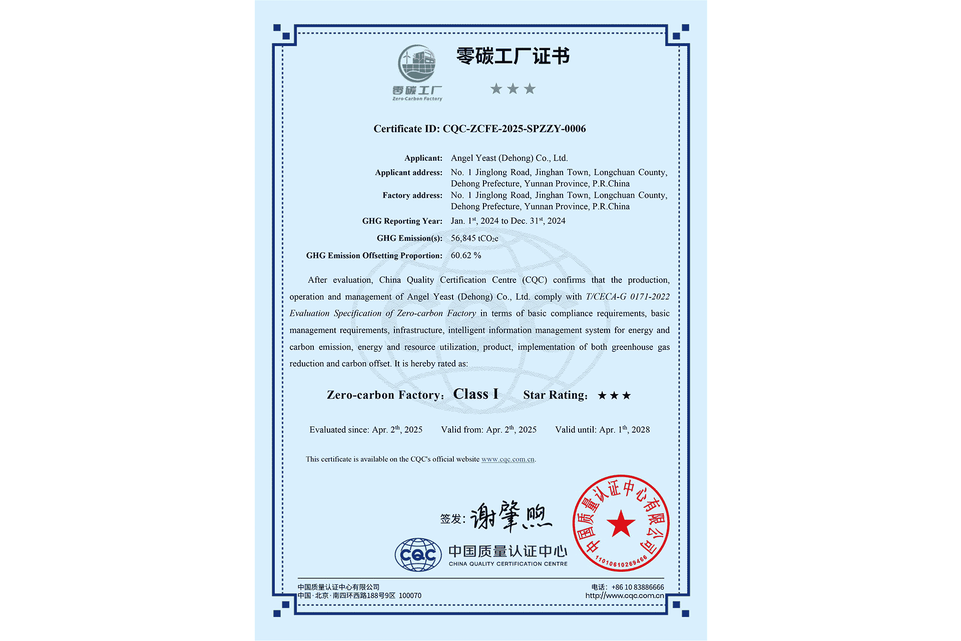 On April 2, Angel Yeast Dehong was officially designated as a Class I three-star "Zero-Carbon Factory" by the China Quality Certification Center. This milestone signifies Angel Yeast's first zero-carbon factory, marking a significant step in the company's dedication to green and low-carbon practices and promoting sustainable development.