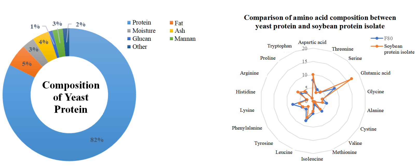 At present, yeast is the only microorganism with an annual output of more than one million tons. Moreover, yeast is rich in high-quality protein and contains 18 encoding amino acids in amino acid composition, including nine essential amino acids for the human body. Except that the sulfur-containing amino acids are slightly lower than the recommended amount of WHO/FAO, the contents of other essential amino acids have reached the recommended value. Yeast protein F80 is rich in lysine, which is usually the first limiting amino acid of the plant protein. Therefore, protein complementarity can greatly enhance the value of compound protein. Moreover, the content of branched chain amino acids (isoleucine, leucine and valine) in yeast protein is also very rich. Branched chain amino acids can be decomposed and converted into glucose faster, prevent muscle loss and promote muscle recovery after exercise.