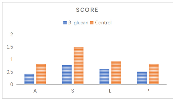 24 healthy female beagle dogs 3 to 4 years old were selected. Two different experiments were performed. The test period was 8 weeks. The test group added 200 ppm of β-glucan to the dry food, and the control group added the same amount of placebo. Increase in score (0-10 points) induced by β-glucan from baseline value (=improvement) for worsening (A), stiffness (S) and lameness (L) and pain (P). The results show that β-glucan can effectively prevent the deterioration of canine osteoarthritis, relieve stiffness, claudication and pain. Experiments have found that supplementation of 1% β-glucan can increase the content of IgA in canine serum (Figure 2) and improve the clinical symptoms of canine osteoarthritis (Figure 3). Compared with placebo (Control) treatment, β-glucan ingested disease worsened, stiffness, claudication and pain scores showed greater numerical improvement.