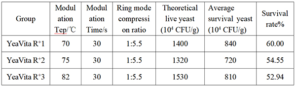 Three batches of YeaVita R+were selected for pelleting in a large scale feed factory, and the product added amount was 1kg/t. The results of feed pelleting (high temperature and high humidity) showed that the survival rate of YeaVita B+ is between 58 and 68%, while the survival rate of YeaVita B is less than 1% which means YeaVita B+ has a good tolerance under the conditions of high temperature, high humidity and ring mold compression prepared during feed granulation (Table 3).