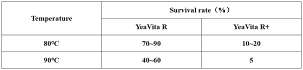The results of the dry heat high temperature tolerance experiment showed that when YeaVita R and YeaVita R+ in the test tube were heated for 3 minutes by 80 ℃ and 100 ℃ water bath, both all have better survival rate, but the survival rate of YeaVita R+ under dry heat conditions is 6.96% and 9.29% higher than YeaVita R, respectively (Table 1).