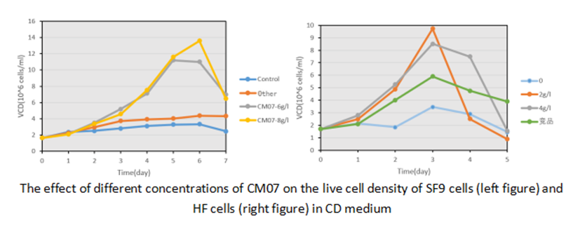 Angel CM07 is a glutathione-enriched hydrolysate with a glutathione content exceeding 10%, promoting cell growth and enhancing metabolic activity in cell culture. When applied to SF9 cell culture, CM07 significantly promotes cell growth, exhibits good cell passaging stability, virus sensitivity, and leads to higher protein expression levels.