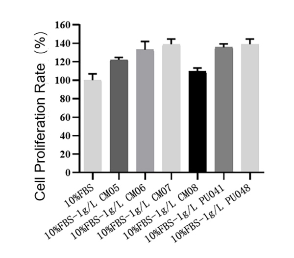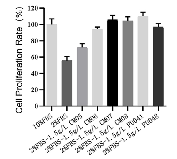 We selected common C2C12 mouse myoblast stem cells as the primary cell line for evaluating stem cell applications. (Figure 1) On the basis of a complete medium with 10% FBS, we added certain concentrations of Angel protein hydrolysates CM05, CM06, CM07, CM08, PU041, and PU048. After 48 hours of culture, CCK8 assays were conducted, and the results showed a certain promoting effect on C2C12 cell proliferation. When serum concentration was reduced to 5% (Figure 2), the experimental groups with Angel protein hydrolysates CM05, CM06, CM07, CM08, PU041, and PU048 still showed a promoting effect on C2C12 cell proliferation, with CM07, CM08, PU041, and PU048 experimental groups even exceeding the proliferation effect of the 10% FBS control group. When serum concentration was further reduced to 2% (Figure 3), under low-serum conditions, the experimental groups with Angel protein hydrolysates CM05, CM06, CM07, CM08, PU041, and PU048 still exhibited significant promoting effects on C2C12 cell proliferation, with the CM07, CM08, and PU041 experimental groups still exceeding the proliferation effect of the 10% FBS control group.