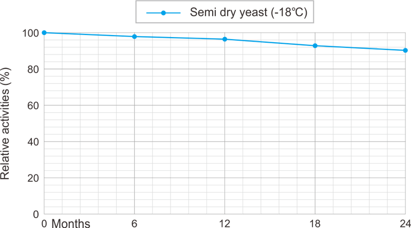 The product activity is stable when the semi-dry yeast is stored at low temperature. Furthermore, the loss of yeast activity is small in the freezing process, which can significantly prolong the shelf life of frozen dough.