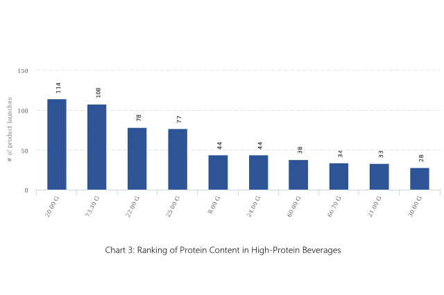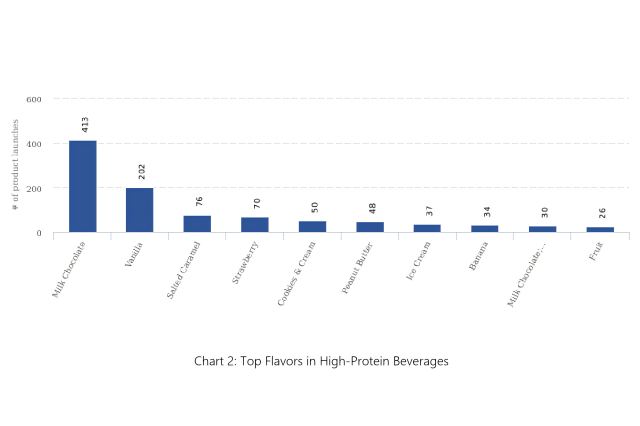 A global analysis of high-protein beverage trends over the past two years, covering brands, product flavors, and protein content, is illustrated in three charts, all sourced from the Innova Database.