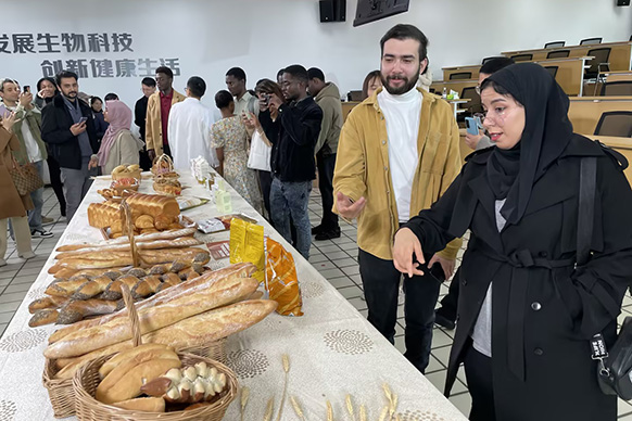 Next, the international students visited the Baking and Food Innovation Technical Center. Xu Yunfeng, the deputy director, taught them about yeast and baking. He also guided them through a fun DIY bread activity. The students from different countries wore special clothes for baking. They made their own traditional bread products, like toast and Arabic cakes.