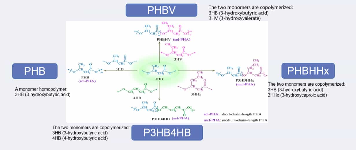Actuellement, quatre types de PHA ont été industrialisés, notamment le polyhydroxybutyrate (PHB), le copolyester 3-hydroxybutyrate 3-hydroxyvalérate (PHBV), le copolyester 3-hydroxybutyrate 3-hydroxycaproate (PHBHHx) et le copolyester 3-hydroxybutyrate 4-hydroxybutyrate (P34HB), qui ont leurs propres caractéristiques les avantages propres aux applications pratiques.