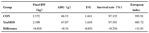 A total of 93000 one-day-old Cobb broilers were randomly allocated to two diet treatments, The basal diet with 0(CON), 1kg/t Yeast cell wall (YeaMOS, provided by Angel Yeast Co. LTD). The test period was 38 d. Compared with the CON group, the diet supplemented with YeaMOS increased the final body weight by about 0.018kg. The average daily gain (ADG) and feed/gain(F/G) in YeaMOS group was increased by 0.54g and 0.031. The survival rate was increased by 0.256%. Additionally, the final European index was increased by 3.0%.