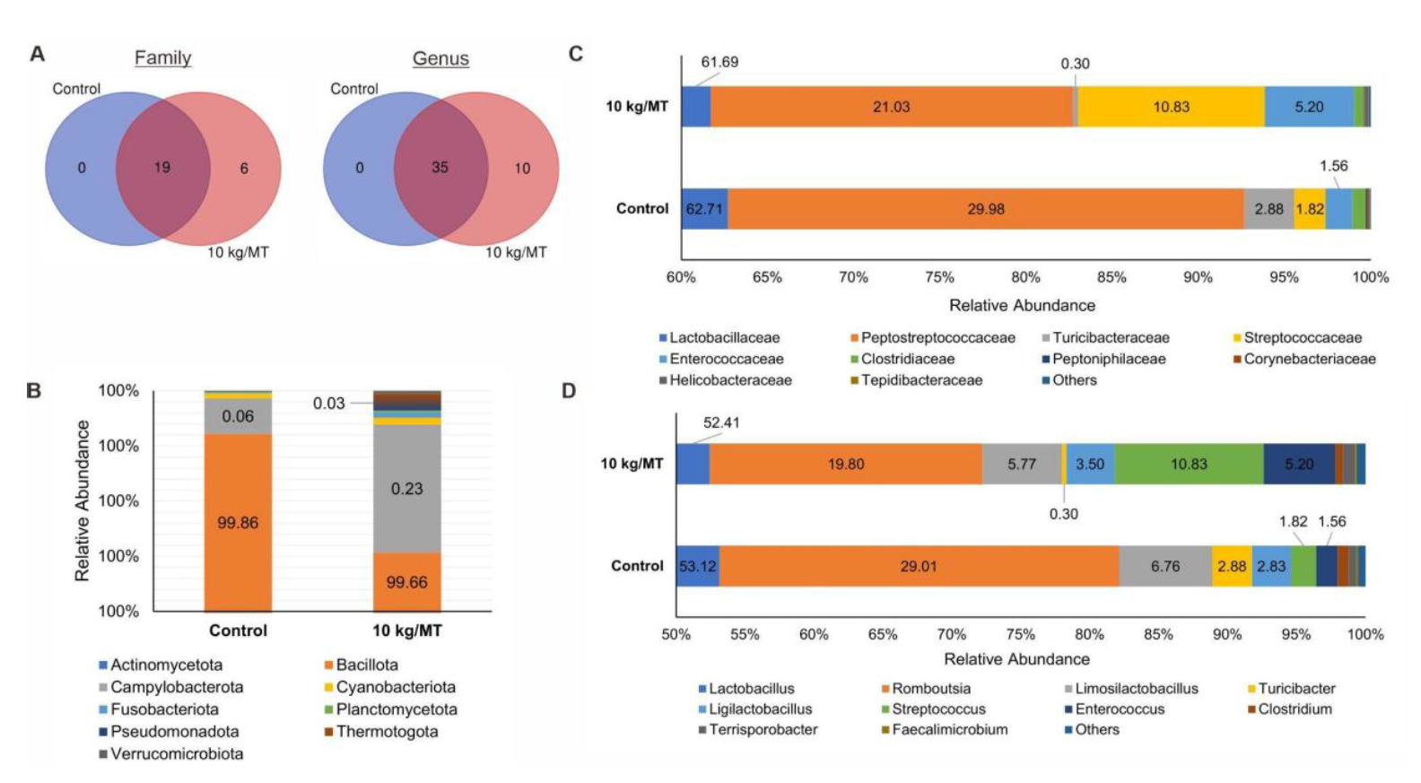 The control group and the 10 kg/ton supplementation group shared 19 families and 35 genera. However, the treatment group supplemented with yeast contained 6 unique families and 10 unique genera, while no unique taxa were identified in the control group. This indicates that yeast supplementation expanded the taxonomic range of the microbiota at both the family and genus levels.Furthermore, GroPro supplementation successfully restored the diversity and structural balance among Lactobacillus species. These findings demonstrate that yeast supplementation at 10 kg/ton exerted a positive remodeling effect on the gut microbiota by enhancing diversity, enriching beneficial taxa, and promoting the formation of a functional microbial network conducive to growth and health.