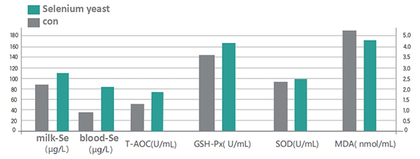 The above results showed that compared with the control group, after 70 days, the milk selenium deposition rate of the test group was significantly increased by 123%, while the MAD content was significantly reduced, and the activities of GSH-Px and SOD enzymes were significantly increased, indicating that yeast selenium can promote the antioxidant capacity of animals, improve the selenium deposition level of the body, and can be used to produce selenium rich milk.