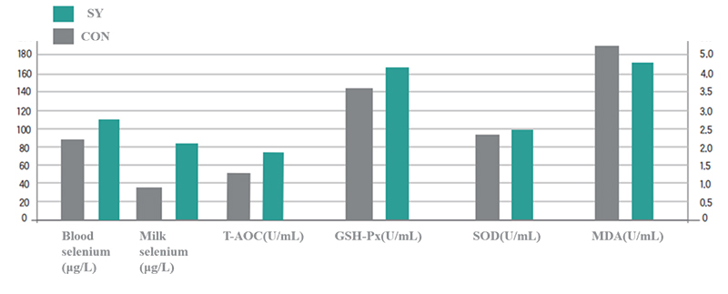Li K N (2011) reported that selenium yeast could improve the visual quality and tenderness of beef and reduce drip loss.In addition, due to the high absorption and utilization rate of selenium in yeast, it can be deposited in milk and can be used to develop selenium-rich milk. Zhuo C Y (2010) reported that adding selenium yeast to sunflower seed oil diet increased the content of selenium in blood and milk, as well as the content of conjugated linoleic acid in milk of lactating cows.Lu Z W (2011) reported that dietary supplementation of selenium yeast significantly increased the milk selenium level of dairy cows, and the milk selenium content increased with the increase of selenium yeast concentration, among which the 15mg/d and 20mg/d selenium yeast treatment groups increased by 277% and 340% on the 40th day of the experiment, respectively, compared with that before the experiment. Wang et al. (2010) showed that adding 0.5mg/kgDM SY to the diet of dairy cows could increase the milk selenium concentration by 74.97% compared with not adding selenium. Juniper et al. (2006) added 0, 0.15, 0.30 and 0.45mg/kgDM SY and 0.15mg/kgDM SS to the diets of dairy cows to explore the effects of different selenium sources on lactating cows. The results showed that the same dose of SY could increase the milk selenium concentration by 34% compared with SS. The concentration of selenium in milk increased significantly.In a cooperative study with the Chinese Academy of Agricultural Sciences, it was found that the addition of yeast selenium significantly increased the antioxidant capacity of dairy cows, and the milk selenium deposition was increased by 123%, which could be used to develop selenium-rich milk.