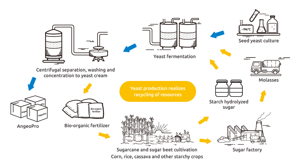The nutrient sources of yeast are sugarcane and beet molasses, and starch hydrolyzed sugar as a supplementary source. These nutrients are collected and then processed in a sugar factory to create molasses. Seed yeast culture is then combined with the molasses to ferment the yeast before embarking on centrifugal separation, washing and concentration to produce yeast cream. The resulting yeast cream is then used to produce Angel Yeast Protein. The industrial wastewater of yeast production uses organic fertilisers for crop production.