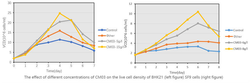 Angel CM03 is a small-peptide-enriched hydrolysate with low osmotic pressure, applicable to various cell lines such as BHK21, SF9, HF, MDCK, HEK293, and possesses a certain degree of universality.