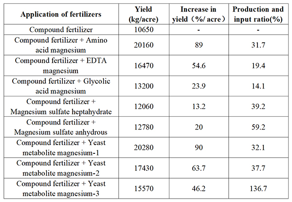 By taking the average fresh weight of spinach as the main factor, the results of the evaluation of spinach yield of each treatment showed that, under the same input, the yeast metabolite magnesium compared to amino acid magnesium yingmu can increase the income of 180 yuan, compared to EDTA magnesium yingmu can increase the income of 5,715 yuan, compared to the sugar alcohol magnesium yingmu can increase the income of 10,620 yuan, compared to the heptahydrate magnesium sulfate yingmu can increase the income of 12,330 yuan, compared to the anhydrous magnesium sulfate Ying mu yield can increase income 11250 yuan, and the input-output ratio are higher than other treatment groups with the same input.