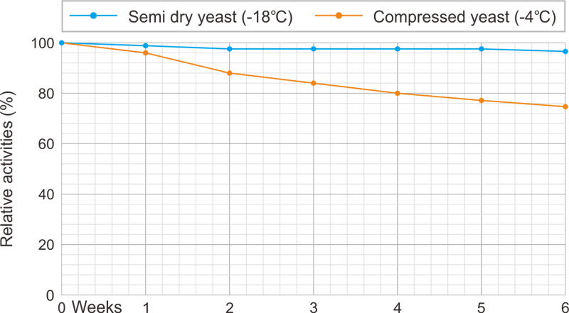 The product activity is stable when the semi-dry yeast is stored at low temperature. Furthermore, the loss of yeast activity is small in the freezing process, which can significantly prolong the shelf life of frozen dough.