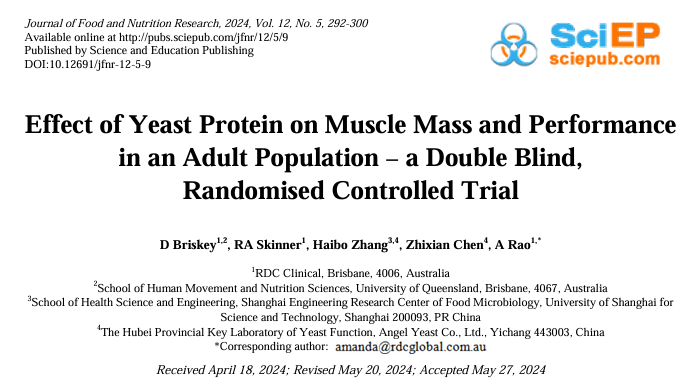 4.Briskey, D., Skinner, R. A., Zhang, H., et al. Effect of Yeast Protein on Muscle Mass and Performance in an Adult Population – a Double Blind, Randomised Controlled Trial. JOURNAL OF FOOD AND NUTRITION RESEARCH, 2024, 12(5):292-300.