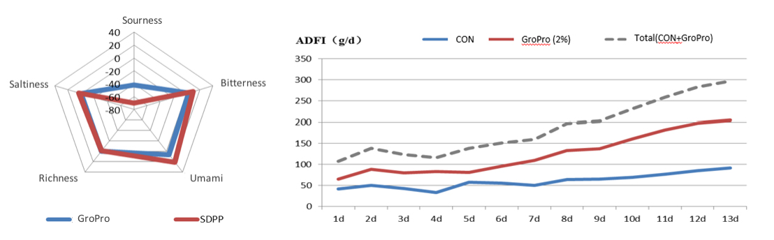 Hydrolyzed yeast is also rich in flavor compounds that animals like, such as flavor nucleotides (IMP+GMP) and peptides (Gly-Gly, Gly-His-Gly, Gly-Gly-His etc.) and amino acids. Lot of studies found that GroPro has almost same palatability with some other functional proteins such as SDPP or fish meal depending on laboratory as well as animal experiments.