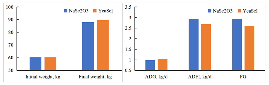 Compared with Sodium selenite(CON), yeast selenium(YeaSel) had no significant effects on final weight, ADG, ADFI and F/G of fattening pigs (P>0.05), but could slightly improve the performance of fattening pigs.