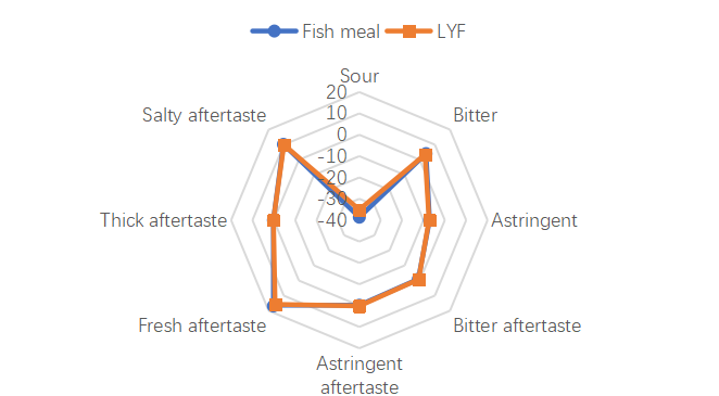Fish meal substitute products are endowed with a unique fish aroma through special processes, which can make them closer to fish meal. Its taste is also very similar to fish meal, as confirmed by electronic tongue evaluation (Figure 1).