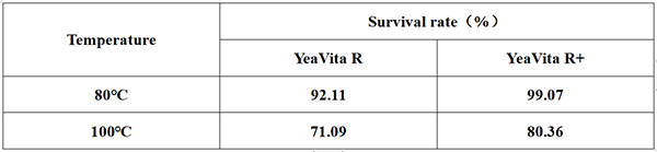 The results of the dry heat high temperature tolerance experiment showed that when YeaVita R and YeaVita R+ in the test tube were heated for 3 minutes by 80 ℃ and 100 ℃ water bath, both all have better survival rate, but the survival rate of YeaVita R+ under dry heat conditions is 6.96% and 9.29% higher than YeaVita R, respectively (Table 1).