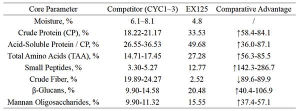 Compared to competitor yeast cultures (CYC1~3), YeaFerm EX125 demonstrates superior protein metrics: dry matter (DM) basis crude protein (CP) is increased by 58.4~84.1%, acid-soluble protein as a proportion of CP, total amino acids (TAA), and small peptide content are all higher. Crude fiber is reduced by 89.6~89.9%, enhancing digestibility. Yeast-derived prebiotics such as β-glucans and mannan oligosaccharides are present in higher concentrations, promoting beneficial bacterial colonization.