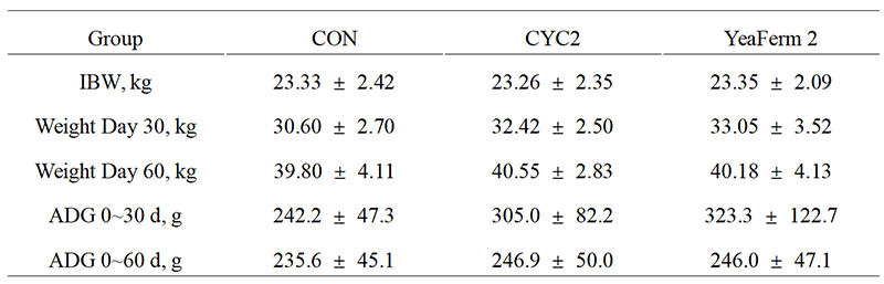 A study involving sixty 3-month-old fattening lambs supplemented with either CYC2 or YeaFerm EX125 (10g/head/day) evaluated body weight at days 30 and 60. Rumen fluid was collected post-trial for high-throughput sequencing and microbial analysis.
