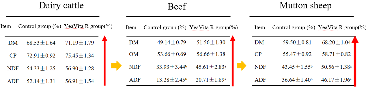 Research by Shengmu High-tech in 2014 showed that YeaVita R significantly reduces nutrient residues in feces. Additionally, studies by Sichuan Agricultural University in 2014 demonstrated that YeaVita R increases the rumen degradation rate of roughage by 5-10%, and studies from Hebei Agricultural University in 2019, China Agricultural University in 2016, and Sichuan Agricultural University in 2014 showed that YeaVita R improves the apparent digestibility of nutrients by 5-20%.