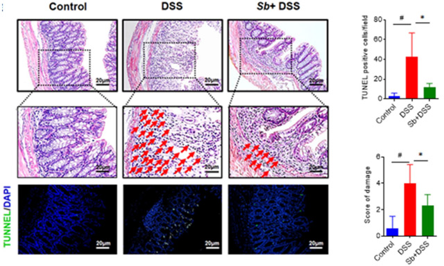 Fig.2 FOS + Bld-3 group (LFSb & HFSb) significantly alleviated the clinical signs of colitis in mice (A) Histological scores; (B) Staining of colonic tissues