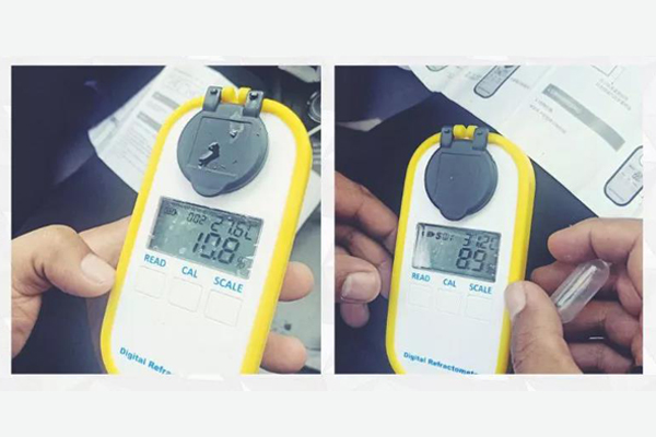 Seeing that there was no hope for a bumper harvest, in order to restore this orchard and reduce losses, agricultural technology experts of “Fubon” gave some advises for Boss Yang: Using “Fubon” organic fertilizer (powder water soluble type) + “Newbom” full water soluble compound fertilizer (NPK: 15-5-30) package. After applying the "Fubon" + "Newbom" package fertilizer for 25 days, the time was right for a harvest. The “Fubon” team found that the plum fruits were good and fruitful; the trees were good, the leaves were green and shiny. By testing the sugar content, the plum on the left side which has used the Fubon + Newbom package reached 10. 8, and the right side which has used the other fertilizer was only 8. 9, which has clearly difference.