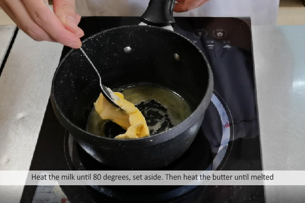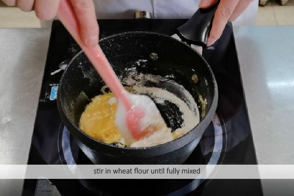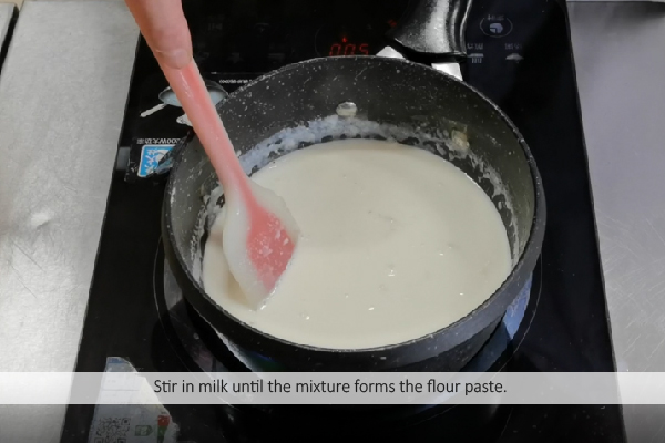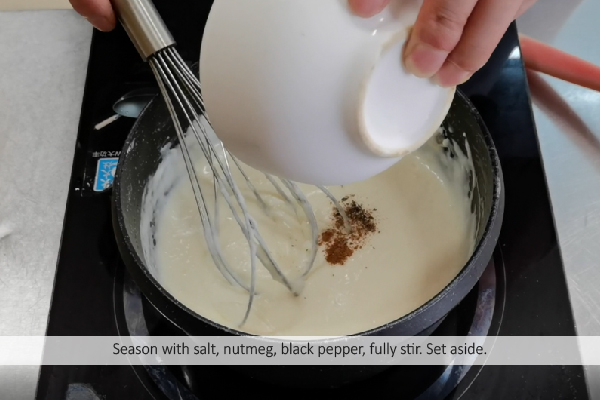 Heat the butter until melted, stir in wheat flour until fully mixed. Stir in milk until the mixture forms the flour paste. Season with salt, nutmeg, black pepper, fully stir. Set aside.