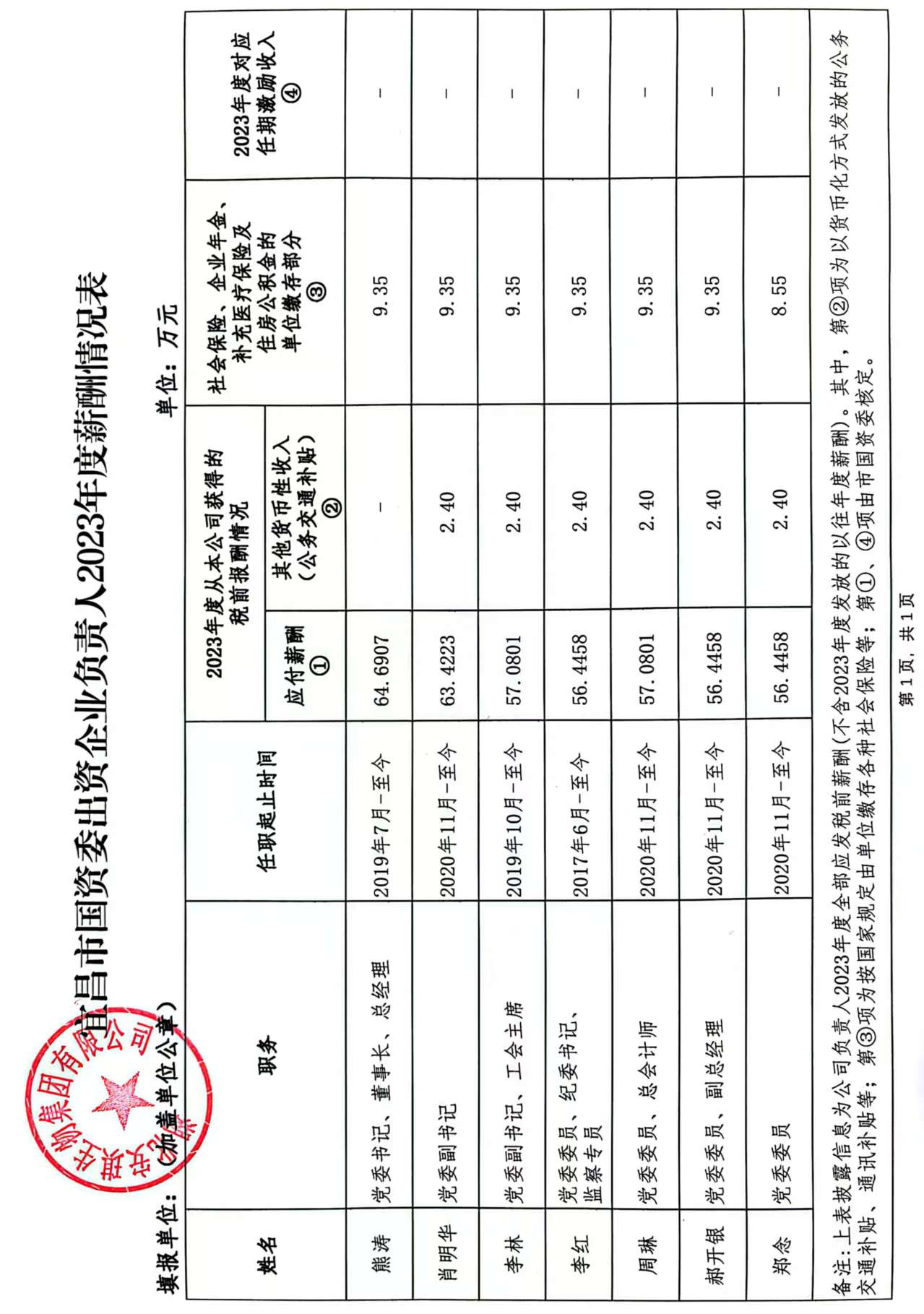 宜昌市国资委出资监管企业负责人2023年度薪酬情况表