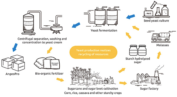 A indústria da levedura é o modelo de uma economia circular. A cana-de-açúcar e o melaço de beterraba são a fonte de nutrientes da levedura, e as águas residuais industriais da produção de levedura são a fonte de fertilizante orgânico para a produção agrícola. (Fig.8) A Angel fornece produtos económicos aos seus clientes, ao mesmo tempo que maximiza os benefícios sociais para apoiar e promover o desenvolvimento sustentável da indústria da levedura.