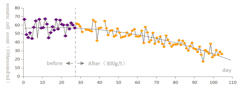 There are many reports on the enhancement of the immunity of ruminants by yeast selenium. Huang et al. (2004) found that the transformation ability of lymphocytes was enhanced and the percentage of lymphocytes increased with the increase of selenium supplementation days when studying the effect of se-enriched yeast on the immune function of cows.Lv Z W (2011) studied perinatal cows and found that on the 7d and 21d postpartum, the levels of IgM, IgG and IgA first decreased and then increased with the increase of supplemental level. Secondly, selenium, as the active component of GSH-Px, plays an important role in the body's antioxidant defense system. Selenium yeast can improve the body's antioxidant capacity, reduce oxidative stress, relieve heat stress, and reduce somatic cell count.Zhang Nu (2009) found that under heat stress, the addition of selenium yeast could reduce the body temperature of dairy cows by 0.33℃, and the plasma endotoxin was significantly reduced. Luo et al. (2010) showed that feeding 2.4gSY per day to perinatal cows significantly increased the activity of GSH-Px in serum of dairy cows compared with the group without selenium supplementation.We added 300g/t of selenium yeast(2000ppm) to the refined supplement of 360 lactating cows for 80 days. The results showed that the somatic cell count of milk gradually decreased from 592.3 thousand to 273.4 thousand, with a decrease of 53.8%.