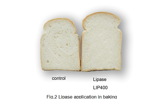 Fungal α-amylase is the basic enzyme used in bread making. This experiment used both fungalα-amylase and lipase. In final result, the Fig.2 shows texture is much better than control (without lipase). Compared with result in exp1, the texture of LIP400 is smoother.