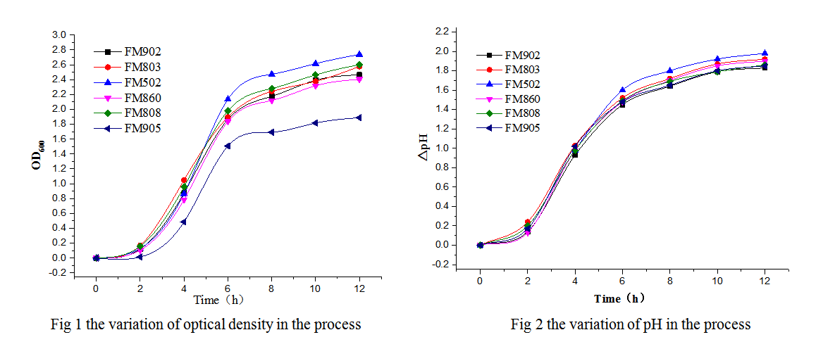 Fig 1and Fig 2 shows the optical density and pH variation of different Yeast Extract for Lactobacillus acidophilus in detail, Fig 3 and Fig 4 show the final viable count and the variation of viable count after storage for 3d or 7d. The results present optical density ranges from 2. 4 to 2. 8 at the end of the fermentation of Lactobacillus acidophilus and make a difference in viable count. While using FM803 as nitrogen source, the highest viable count was observed, but it decreased more than 30% after 7d’s storage. When using the yeast extract that is rich in nucleotides (FM502), the highest optical density was observed, though the viable count was 10% less than FM803 at the end of the fermentation, it showed good stability during storage. Though FM905 has no advantage in gaining biomass, it barely showed decrease in biomass during the storage.